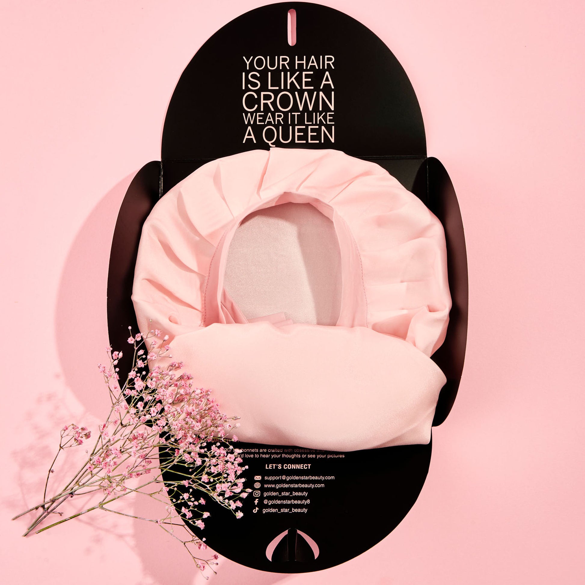 Our hair bonnets are made of 6A grade 100% Mulberry silk. They are designed with the smoother side of the silk on the inside which provides enhanced hair protection.